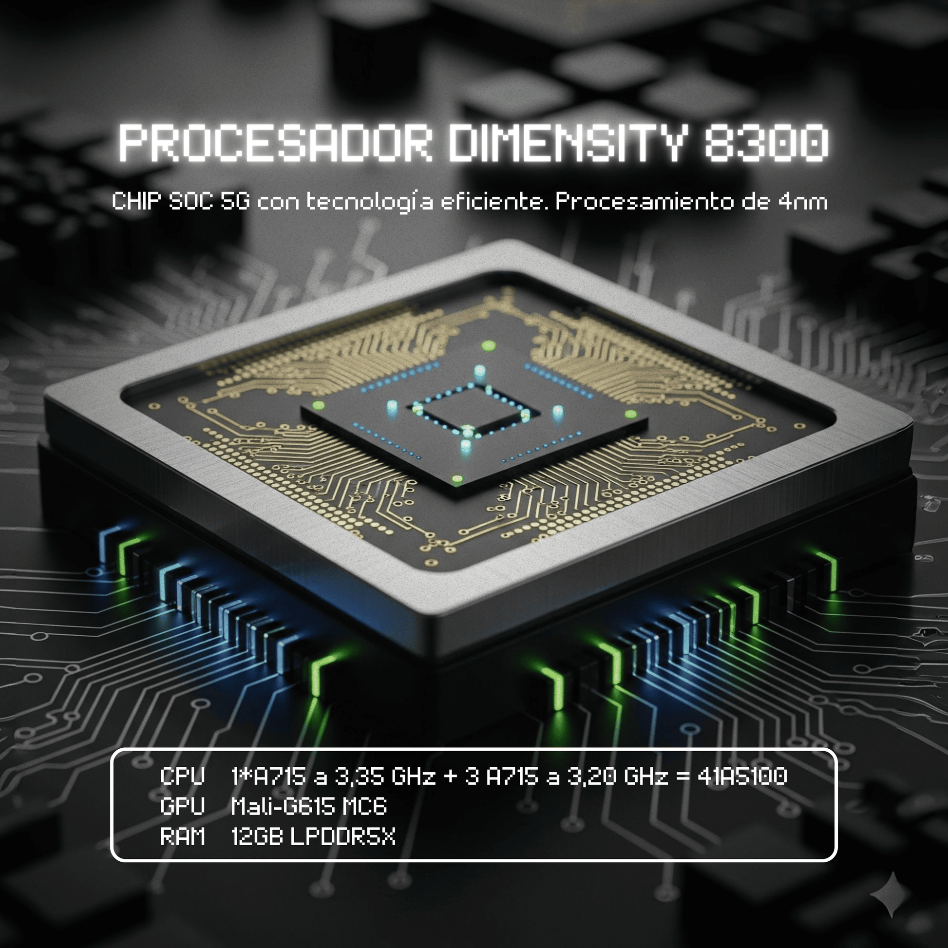 - MediaTek Dimensity 8300 (4 nm) · 8 núcleos · 64-bit