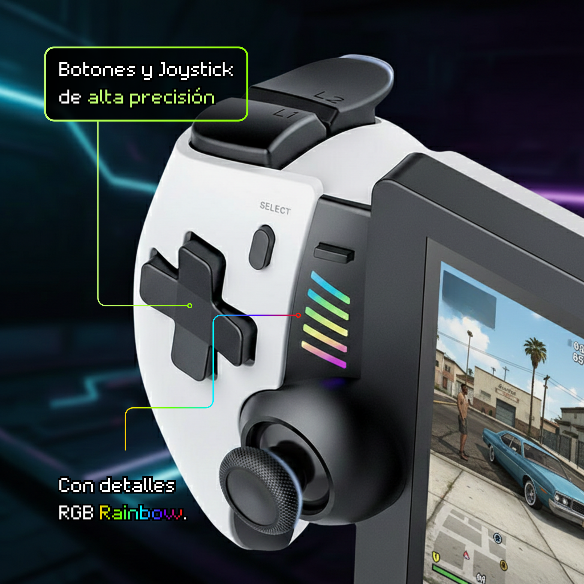 Botones y joysticks de respuesta firme para entradas más estables. Detalles RGB Rainbow para un look gamer sin perder elegancia.