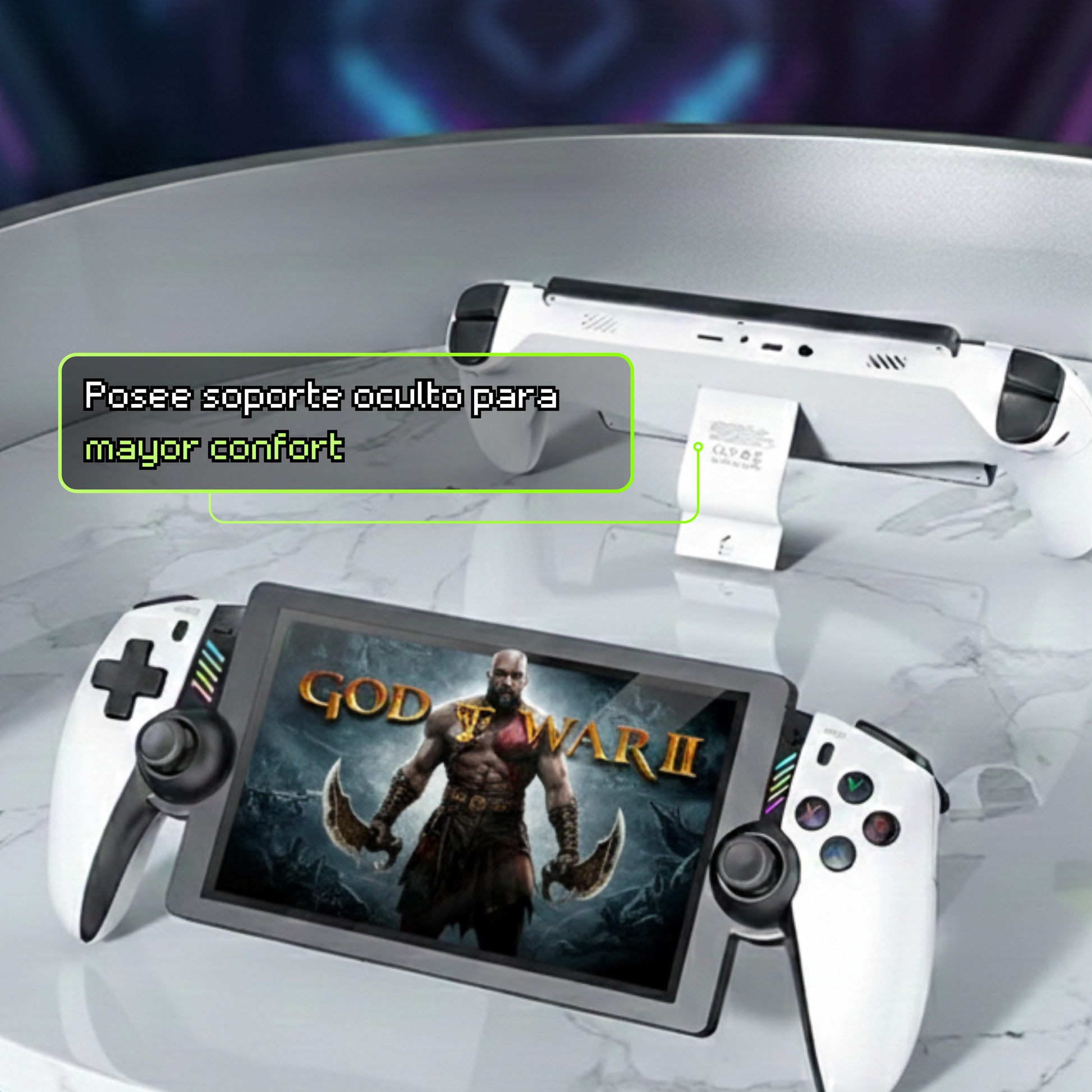 Incluye soporte integrado para jugar en mesa/escritorio con mejor ángulo y estabilidad. Te instalas y sigues.