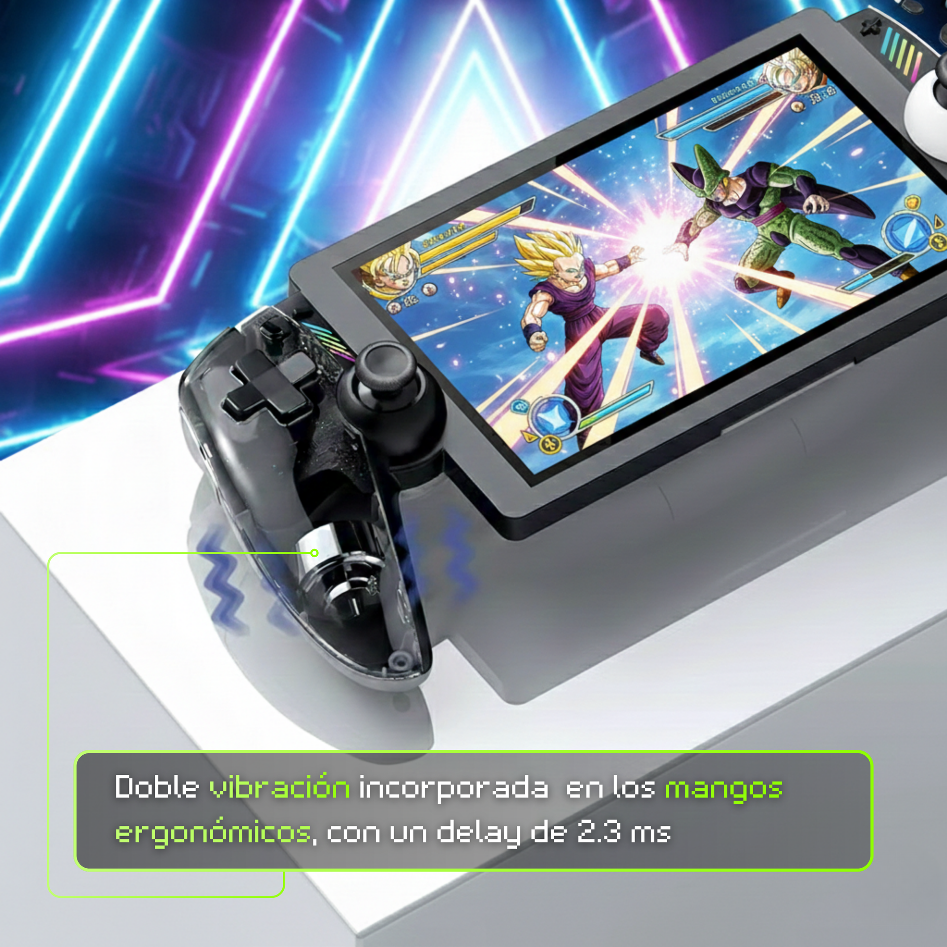 Vibración integrada en mangos ergonómicos para mayor inmersión y control, con baja latencia (2.3 ms).