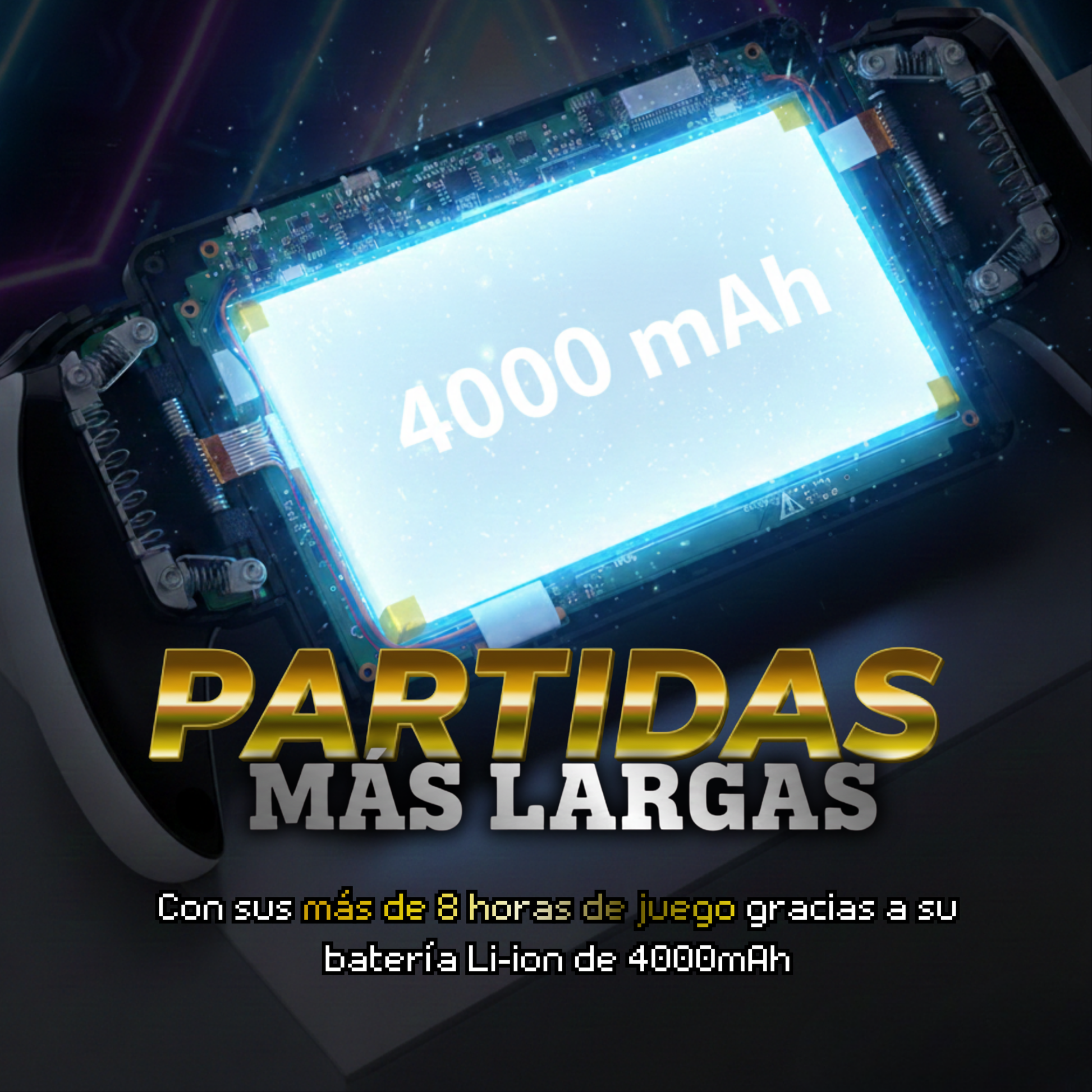 Batería de 4000mAh para sesiones largas. Hasta 8 horas según juego, brillo y emulador.